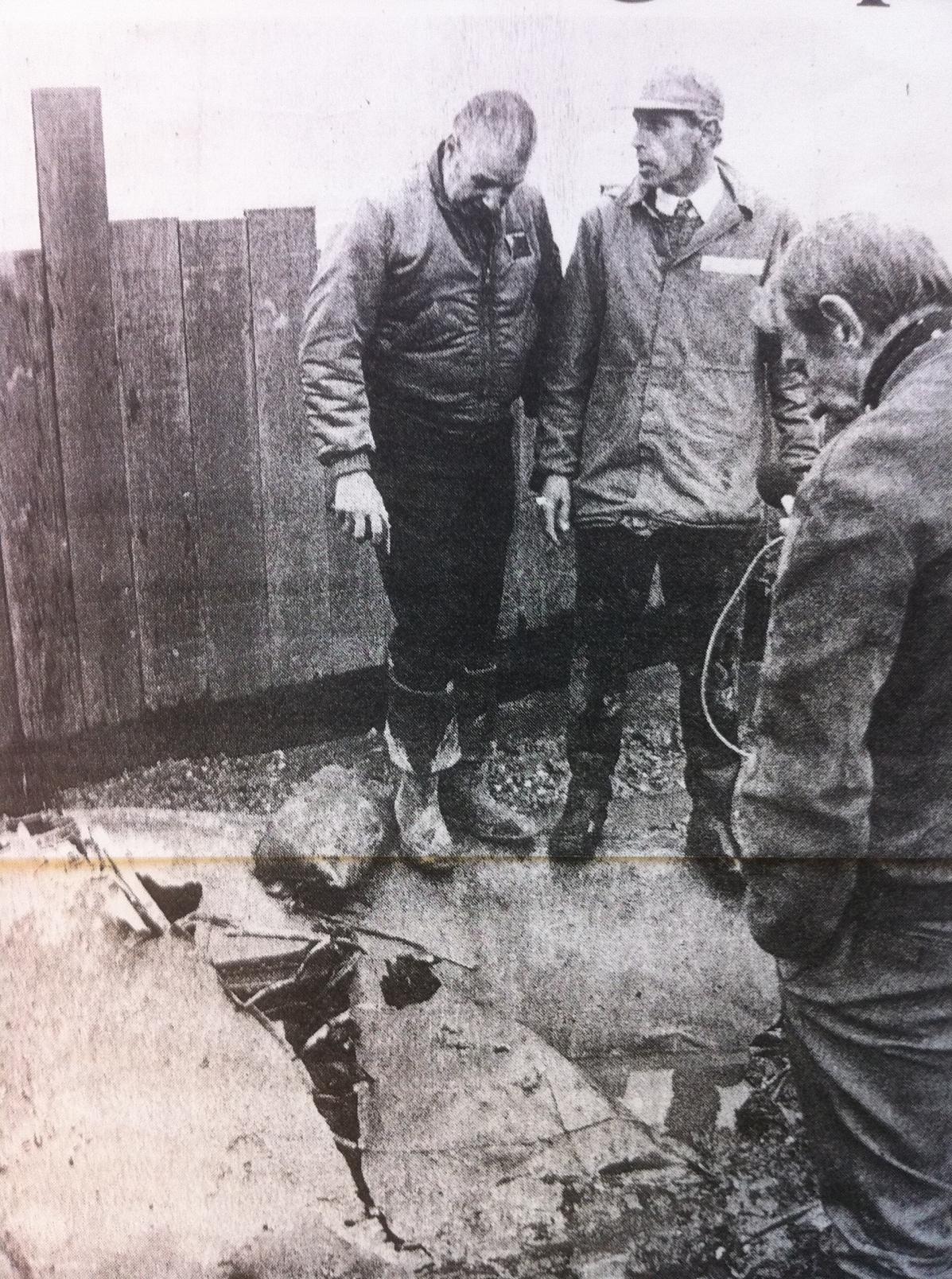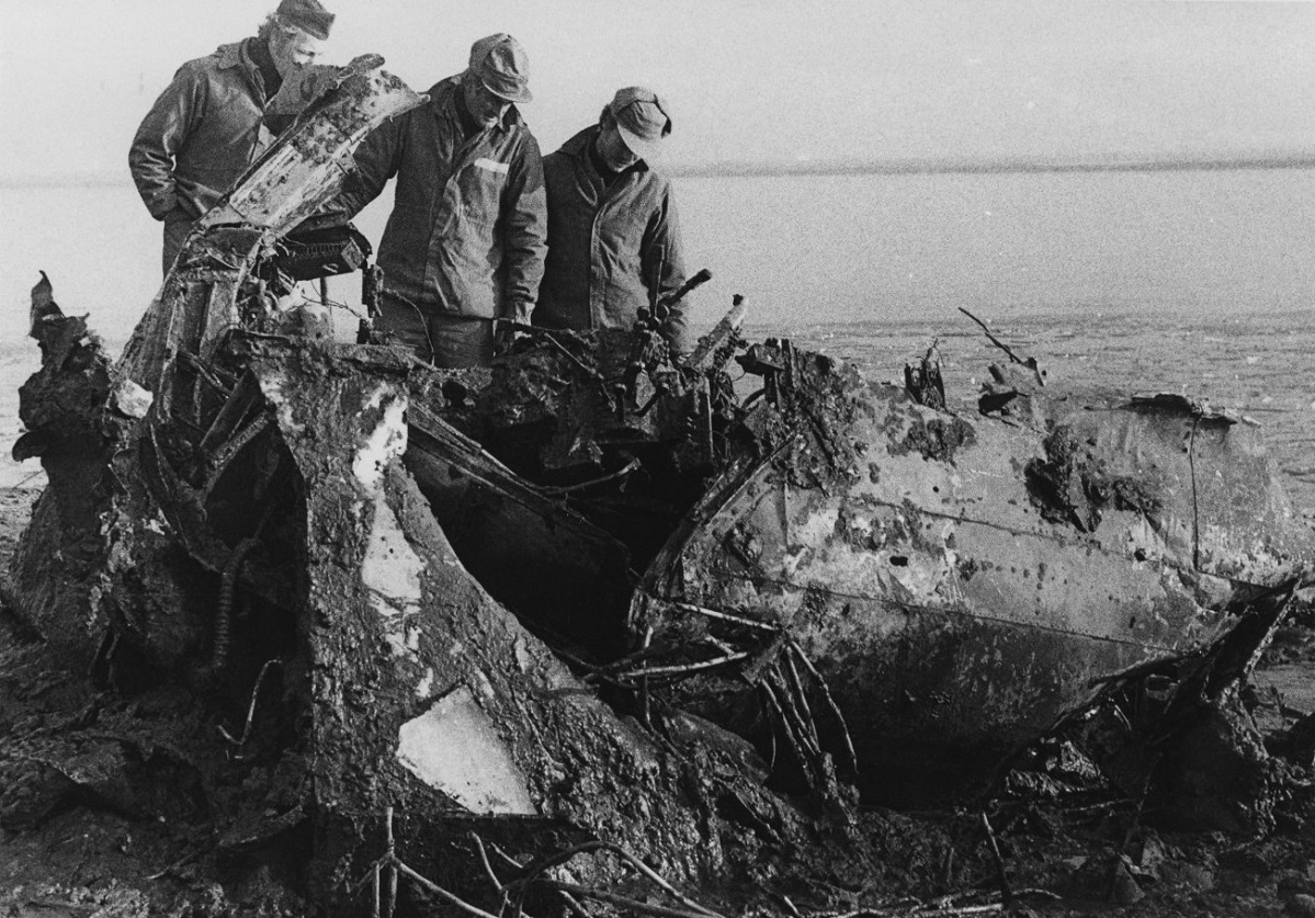 Below, 1975. A soldier of the Dutch AF Recovery Unit and two men of the Dutch Army Grave Recovery and Identification Unit, Adjutant Arie van der Graaf and his trainee Sgt. Harry Jonge (later the successful tracker Captain Harry Jonge 'de Neus/the Nose'). They inspect the cockpit floor at the controls and look at the remains of pilot Kent Miller.
