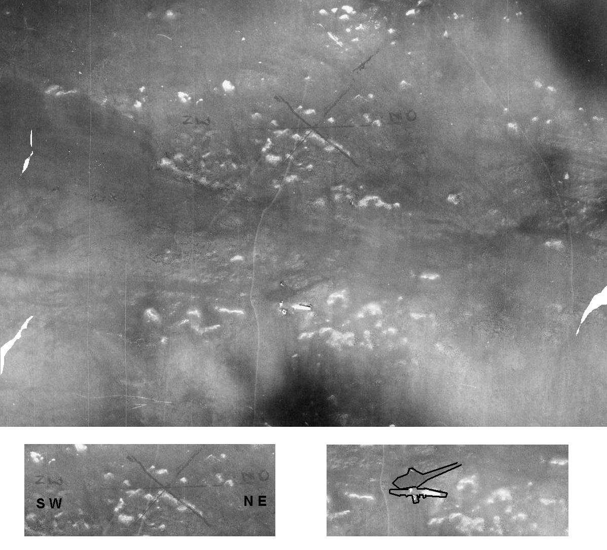 Below: his part of Lake IJsselmeer (Old Zuyder Sea) was made into land 1960. Dykes were laid around the area and water was pumped out. In 1968 when one meter (3 ft) of water was left, a Dutch helicopter (based on shadow an Alouette III) took underneath photo of an aircraft wing that emerged. Location was north of Huizen. Pilot marked rough location on photo. The spot was unknown before and not marked as underwater obstacle or known aircraft wreck on the sea charts 1943-1968. This because the location was not fished and the fishermen therefore never reported it. The wreck lay exactly in the shipping lane Amsterdam (Pampus) to Kampen (entrance IJssel River).