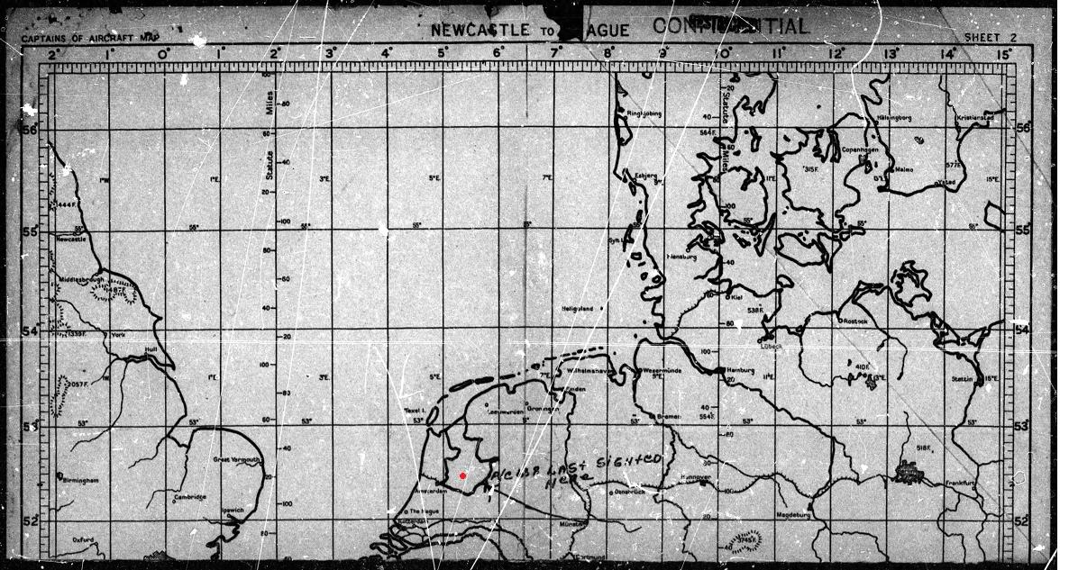 Map above: used in the 44BG-debriefing in England 22 Dec. 1943. A very accurate line is drawn with the course of Miller's missing 42-7638 and where it went under the clouds. Text: "A/C (aircraft) 638 last sighted here". In 1971 it became known that Miller flew on for 17 miles and landed into the sea at the red dot. Weather was bad, it sunk unseen in the shipping lane Amsterdam-Kampen. After 15 minutes a German patrol boat underway to Amsterdam passed the spot and picked-up the almost dead co-pilot Charles Taylor, hanging onto a dinghy in the cold water. They revived him (POW).
