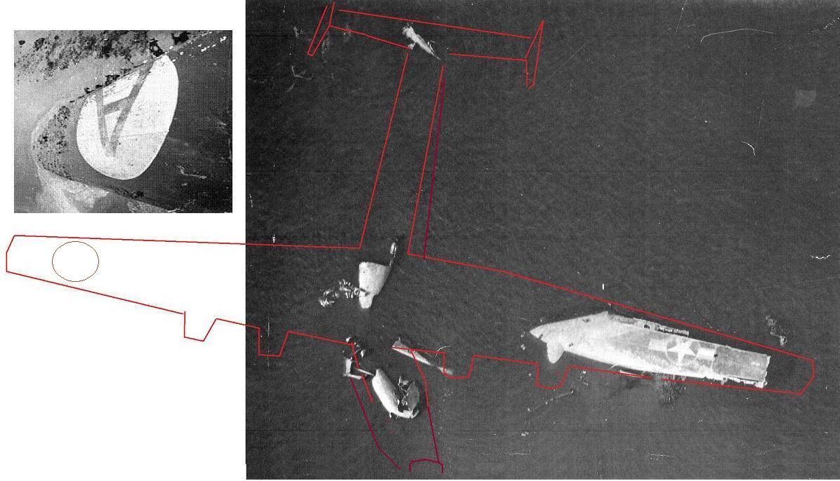 Because this lake contained fresh water since 1932 (salt water before that), the wreck was well preserved. The hard belly landing had broken the back of the aircraft. The USAAF-markings were still the old red outlined ones from 1942. There simply had not been time (or desire) in the 44BG to overpaint them.