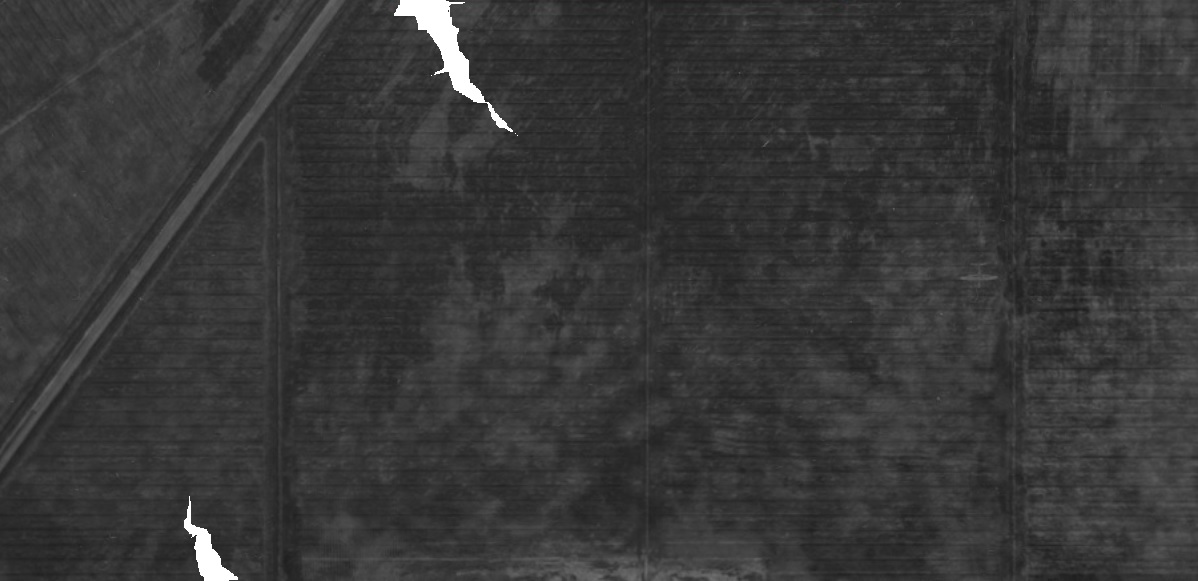 Below: RAF photo, post war 1947. Engines gone. Mud plain has been transformed to new agricultural land, ready for first implant. They carefully worked around the B-17.