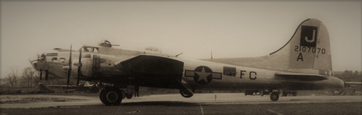 Image shows B-17G 42-107070 in better days, on base in England, not long before in came down at Hoorn, Holland. The J in square in the symbol of the USAAF 390 Bomb Group. FC is the code for the 571 Bomb Squadron. Aircraft letter within the Squadron is A, which is painted on the fuselage (not visible here) and on the tail. Nose-art with aircraft name 'North Star' was on the other side of the nose.
