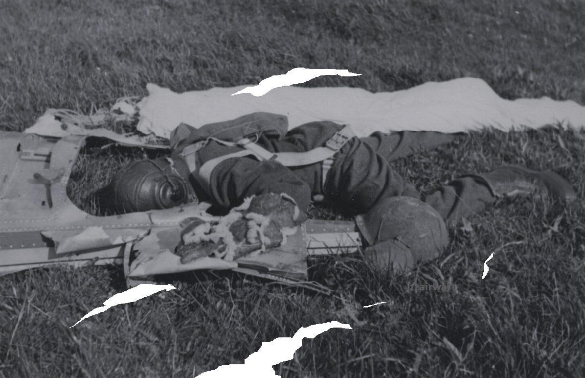 Image below. We have several reasons to believe that this unknown photo is part of the above series of photographs. Witnesses observed this day how a tail gunner jumped from his tail hatch high in the sky, but got entangled with his parachute. He tried to kick himself free, but to no avail. Possibly this is tail gunner S/Sgt. Harry F. Sherman. His M1 helmet sub type USAAF M3 'Flak Helmet' with ear shell protection is laying next to him, back of the helmet pressed into the clay. He was buried initially in Hoorn in grave 1042. Today he rests in American War Cemetery 'Netherlands' in Margraten.