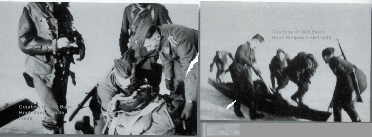 When reaching shore south of Elburg the next day, February 12, 1941 at 16:00 (after 16 hours and 15km), the survivors were spotted and taken prisoner by the Germans. All five underwent medical treatment in the special (bugged) ward for Allied airmen in the Wilhelmina Hospital in Amsterdam. Shortly after that, the stay in the German Stalag prison camps commenced. Sgt. Hall was operated in the famous Obermansfeld Hospital near Frankfurt in Germany where his shank was amputated. Amazingly, in 2009 six photos came from Germany showing the arrest when the five survivors came to shore, see below.