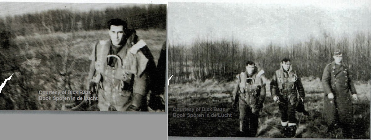 The above photos show piloot Sgt. Bill Garrioch (left) and him with navigator Sgt. Robert Beioley (right) and the German.