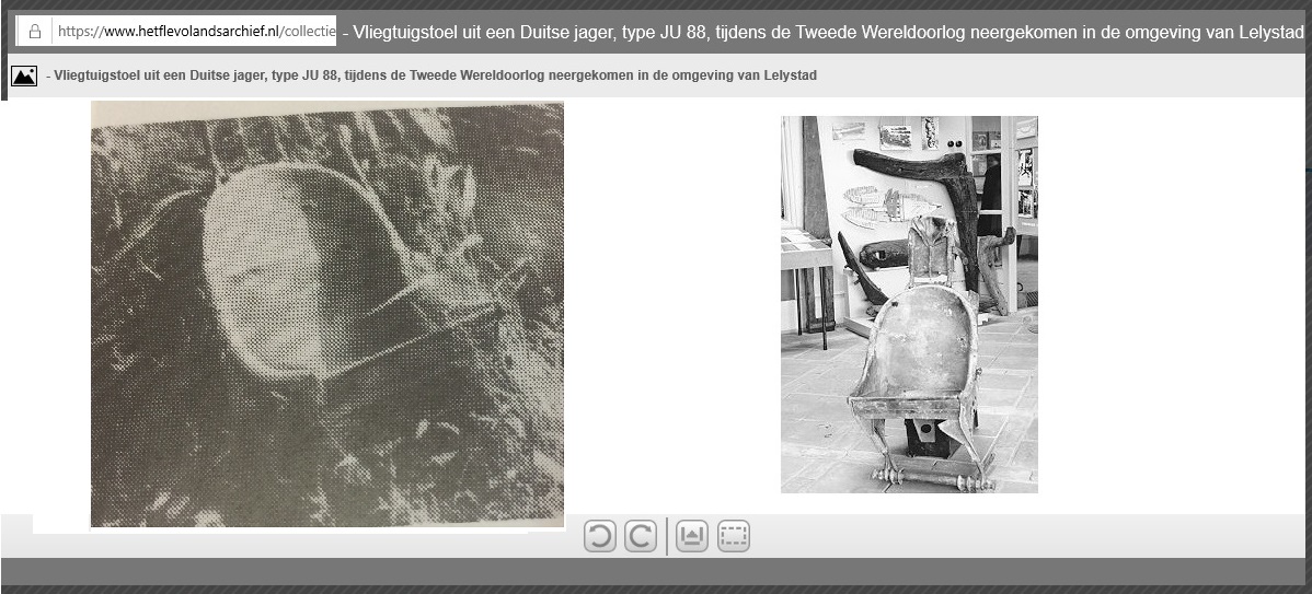Below. July/August 1962. Among the items found that recovery, was an intact bottle of perfume Eau de Cologne. This was highlighted in most newspaper articles on this recovery. Another item was a pilot seat. This was stored in the storage for archeological finds of the ZZW/Dir. Wieringermeer (later 'RIJP'). It was part of a display 10 and 20 years later, the information-card which type of aircraft it had belonged to ('Ju-88 near Lelystad') was still attached, but the Ju-88 itself was not identified. This was succesfully done in 1971.