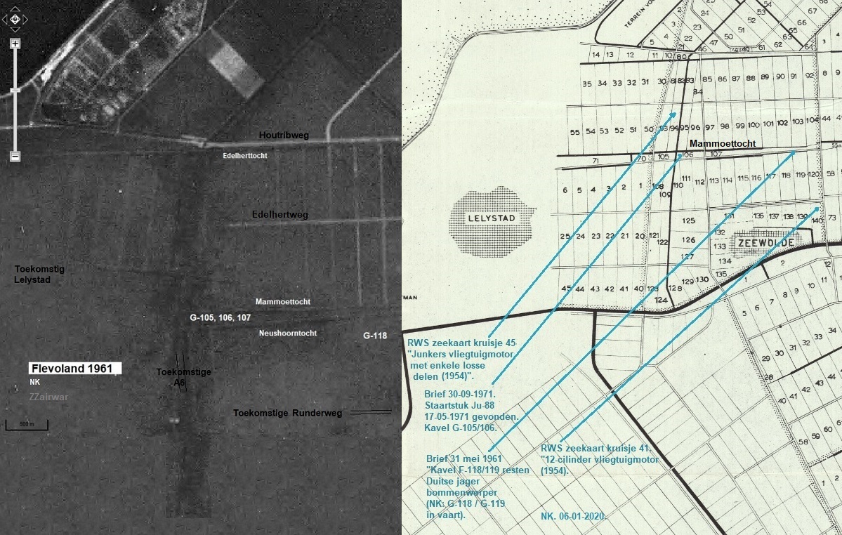 In 1962 the area was filled with reeds and the first sand roads were laid. In 1971, ten years later, the tail section was found in section G-105/106. This identified the JU-88 as the 550283. The sections 71, 70, G-105 towards G-107 and onwards were not farmed initially and is the reason the tail was not discovered before. In this strech a motorway or railroad was planned, running west to east. See map below between canals 'Mammoettocht' and 'Neushoorntocht', trajectory is still very well visible today, but a road or railroad never finalized. Only a walking path brings you close to G-105 and G-118. Nearest roads are Edelhertweg and Runderweg, just east of motorway A6, east in Lelystad.