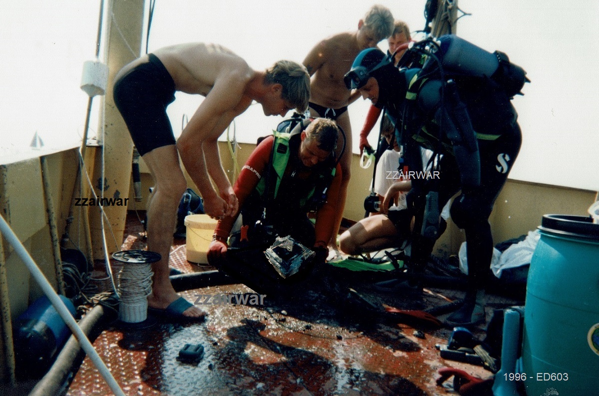In March 1996 the wreck, in remarkable good condition thanks to the emergency belly landing in 1943 in which it flipped over and the fresh water in the Lake, was found by fishing boat VD64 and reported to the authorities. The VD64 took an engine serial number plate off one engine (Rolls Royce Packard Merlin 28, see photos below). With this Dutch Air Force Recovery Officer J. van den Berg and the RAF coud identify the wreck as the since June 1943 missing ED603. A half year later, for publicity reasons to speed up the recovery procedure, the VD64 took an engine with propeller off and delivered it by truck (truck and driver provided for the just cause by Sierbestrating Jonk BV) at the museum of the ARG 40-45 in Heemskerk (Fort Veldhuis).