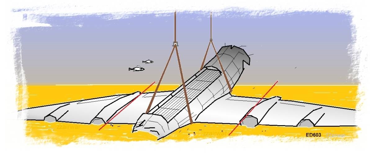 Artist impression of the wreck today, if it were hoisted-up in a future recovery. The red lines on the inside of the inner engine nacelles can be positions to cut through and disassemble the wings. Image thanks to PATS.