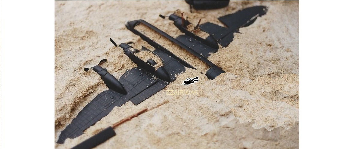 Below. Photo of a model made, situation 1996 first dive. The diver is on correct scale and shows the enormeous size of the Lancaster ED603 belly-up on the sandy seabed.