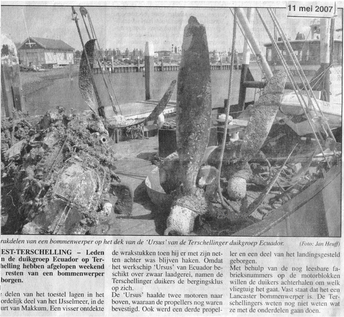 After 1996 the Lancaster was left in peace. However, in 2007 the wreck was raided by a dive group from Frisian Island Terschelling who had learned about this wreck. Their plans with the engines and propellers were stopped by the police who confiscated the material when the boat came into the harbour (photo below). It is unknown what damage was done to the fuselage with the suspected missing men inside.