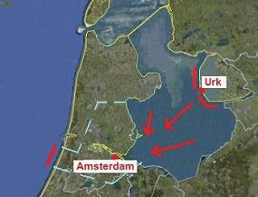 Plot 85. Green: origin Lake IJsselmeer (Old Zuyder Sea). Blue: origin North Sea. Sand colour: land crash.