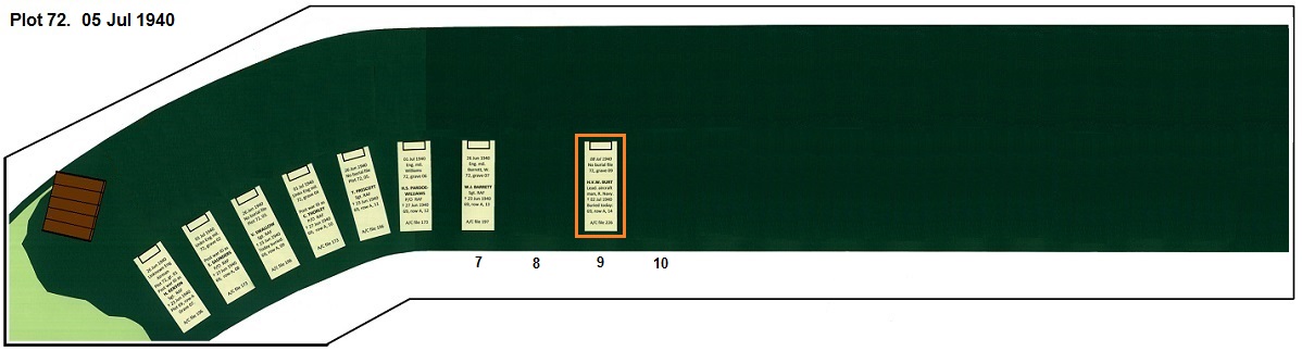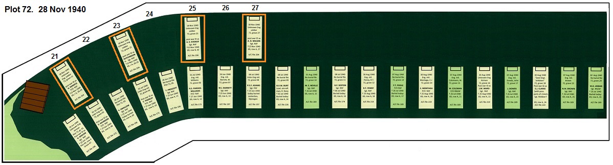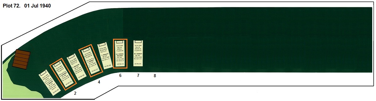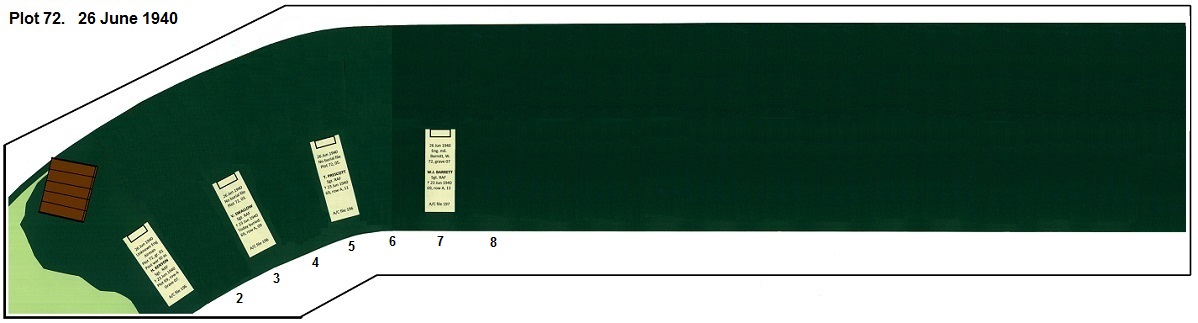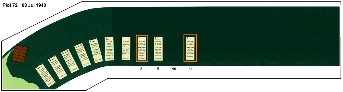 On 23 June 1940 (daylight) the RAF attacked with Blenheim light bombers the German industry in Vohwinkel (Wuppertal) and the railway yards in the German town Soest. Two Blenheims crashed at Amsterdam. One on a farmland in Amsterdam-West near Spaarnwoude/Halfweg (Blenheim IV L8754, P/O T.C. Prescott) and the other in a meadow in Amsterdam-West, today the Sloterplas pond (Blenheim N3593, F/Lt. Stephens POW). Four crew members were buried here on 26 June 1940 in this empty plot: Sgt. Kenyon (grave no. 1), Sgt. Swallow ( grave 3), P/O Prescott ( grave 5) and Sgt. Barrett of N3593 (grave 7). They usually kept one grave spacing in between. Space was needed for the planking around each grave to stand on and lower the coffin.
