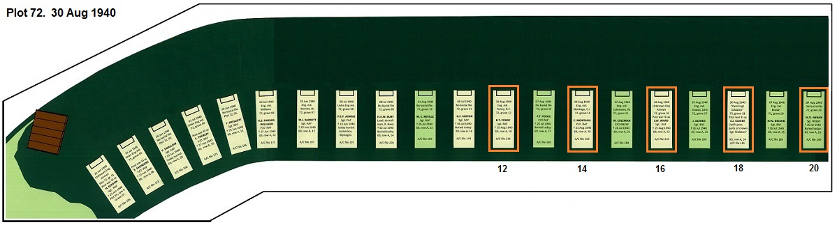 Crew buried here 30 August: Sgt. Penny (grave 12), Pilot Officer Montagu (14), Sgt. Ward (16) and Sgt. Clarke (18). Together with them was also buried Sgt. Annan (New Zealand), recovered from lake IJsselmeer (grave 20), rear gunner of Coleman's crew.