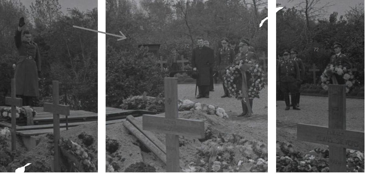 In the background of underneath burial, the Allied Plot 72 is visible. The arrow points at the tool shed left on Plot 72 and the first wooden crosses. This photo dates summer 1940. A German Kriegsmarine (Navy) seaplane Lt. zur See at the grave of a KIA crew member, died after an emergency landing in Lake IJsselmeer. Seaplane base commander Dr. Pössel holds the flowers on the centre photo.