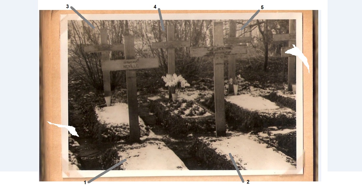 Photo below: graves of Sergeant Neville (1) in grave 10 and Sgt. G.T. Sexton (2) in grave 11. At the time of burial, the back row was not there yet. Photo dates winter 1945.
