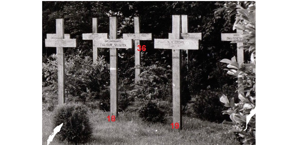 Sgt. Edwin J. Clarke in grave 18 was first buried as unknown (without name). On his cross (photo below) was engraved in German "ZWEI UNBEKANNTE ENGLISCHE SOLDATEN" (Two unknown English soldiers). Possible in this grave were also body parts of other crew members of his aircraft, or Sgt. Annan was placed (later) with him. Grave 19 has engraved 'N.W. Brown' (Wellington R3235). In 1940 back row was not there yet. Photo dates summer 1945 or 1946.