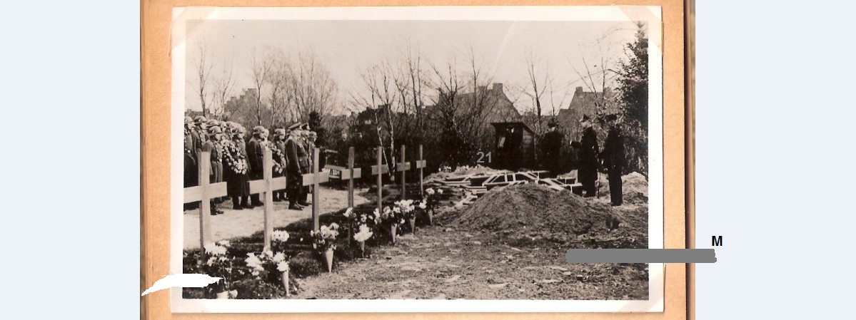 28 November 1940. Photo from another angle. The man in black speaking over the grave is a German Navy Marine Pfarrer (Chaplain). The men in black uniform next to him are civil cemetery employees. For the occasion the wooden crosses on grave 1 to 9 are removed. They can be replaced without error, because each grave is also marked with a low black pole with the grave number. At the grey line with 'M' will be buried F/O McVie six months later.