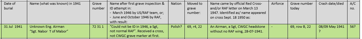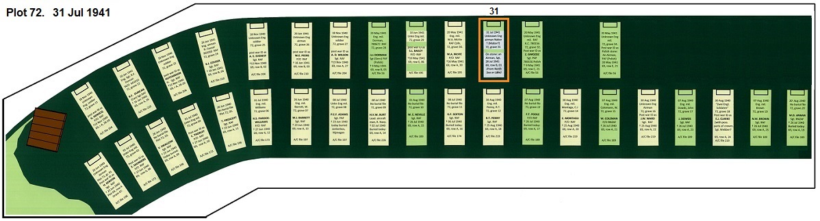 31 july 1941. Unknown Airman, a Sgt. Buried in grave 31 next to Gwozdz. "Not normal RAF". There are today two Polish Sergeants still missing of Jan Dorman's crew: Air gunners/Radio Operators both Plutonowy (Corporal) Henryk Franciszek Sikorski and Stanislaw Pisarski.