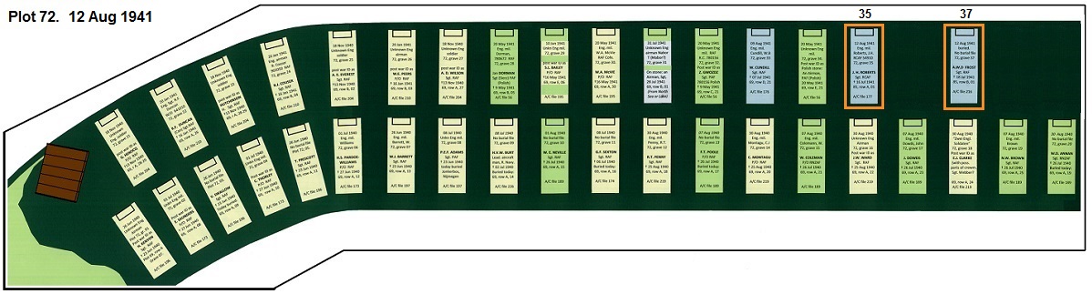 Grave 35 and 37. Sgt. J. H. Roberts of Canada (North Sea in Wellington R3171, raid on Duisburg) and Sgt. Frost (North Sea, Stirling N6030, raid on Wesel).