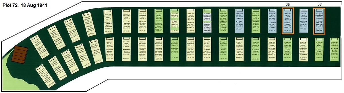 Above. Grave 36, Sgt. Frederick J. Wood (North Sea, Hampden X3118, raid on Essen), buried with an unknown RAF airman Sgt. 18 Aug 1941 in grave 38. On the above photo cross 36 reads: "SERGEANT F.J. WOOD". On the cross next to him (grave 37) is 'FROST'. Cross grave 38 (most right) has "UNBEKANNTE ENGLISCHE FLIEGER".