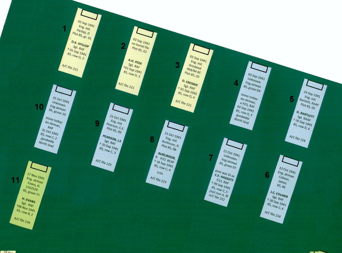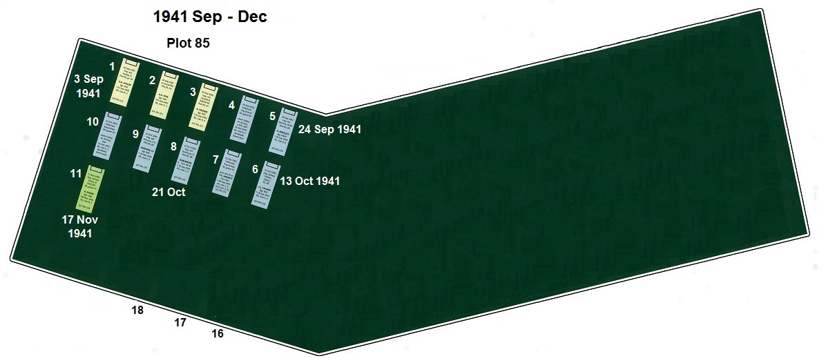 Burials in Plot 85 started in left upper corner of the field, back row, grave 1 to 3. Cemetery no. for this grave is '85-01-1'. Meaning: Plot 85, grave 01, deep 1 (one coffin in this grave). After the war, the graves were re-coded by the CWGC. They named the back row '85, row D, grave 1 - 20', second row from the back '85, row C, grave 1 - 20, etc. First three burials involved the crew of Blenheim V5525 that was shot down by Flak in an attack on Schiphol Airfield, crashed west of Amstelveen, night 30 August '41.