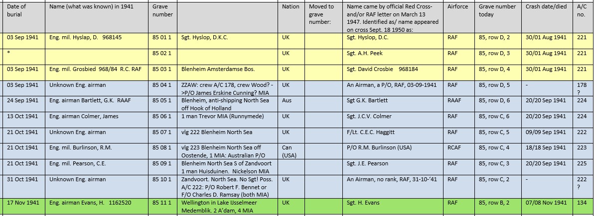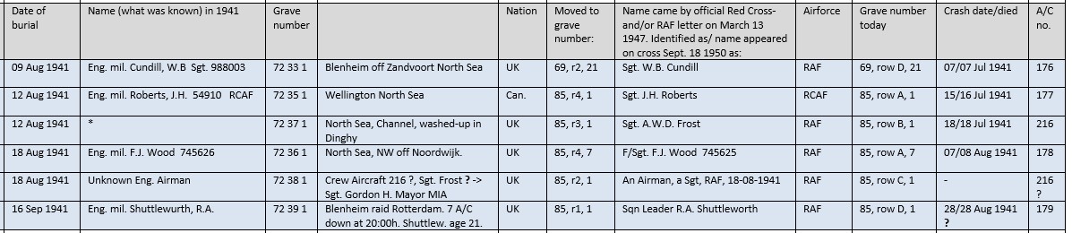 The airmen in grave 5 to 10 washed ashore end Sept. and in Oct. 41 at Zandvoort North Sea beach. Their aircraft were all Blenheim light bombers: 09 Sept 1941 Blenheim Z7312, pilot Haggitt (2 MIA), 18 Sept 1941 Blenheim V6380 pilot Hislop (1 MIA), 20 September 1941 Blenheim V6422 pilot Colmer (1 MIA) and Blenheim R3843 pilot Pearson (1 MIA). The unknown RAF airman in grave 10 washed ashore on the same beach and can have a relation with these aircraft, possible crew Z7312 or V6380.