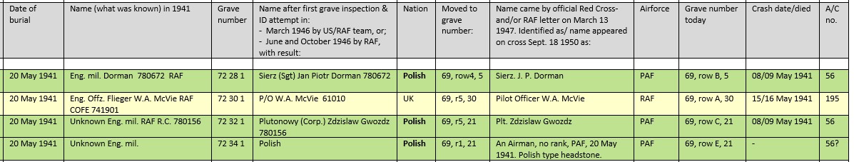 20 May 1941, burial of four men: three Polish airmen found on Lake IJsselmeer SW of Lemmer, their bodies delivered at Amsterdam-Schellingwoude. Pilot Officer McVie (grave 30) was found dead next to his crashed aircraft at Overleek (2,5km behind the Texaco petrol station at Monnickendam). Their aircrafts were Wellington R1322, shot down in the Lake while underway to Bremen 08/09 May '41. McVie's Hampden AD841 came damaged back from Hannover 15/16 May 1941.
