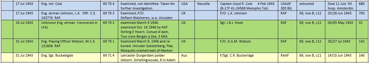 Australian F/Sgt. Clement Buckeridge's Lancaster DV160 crashed night 14/15 June 1943 on the Lake shoreline at Durgerdam (Polder IJdoorn). His crew were buried in the days after the crash, but Sgt. Buckeridge was buried with RAF Flying Officer Watson on 31 July 1943 in grave 71-4 and 70-1. This late burial suggests Buckeridge was found when the Germans cleared the wrecksite or that Sgt. Buckeridge was also found from the Lake south of Marken Island as Watson.
