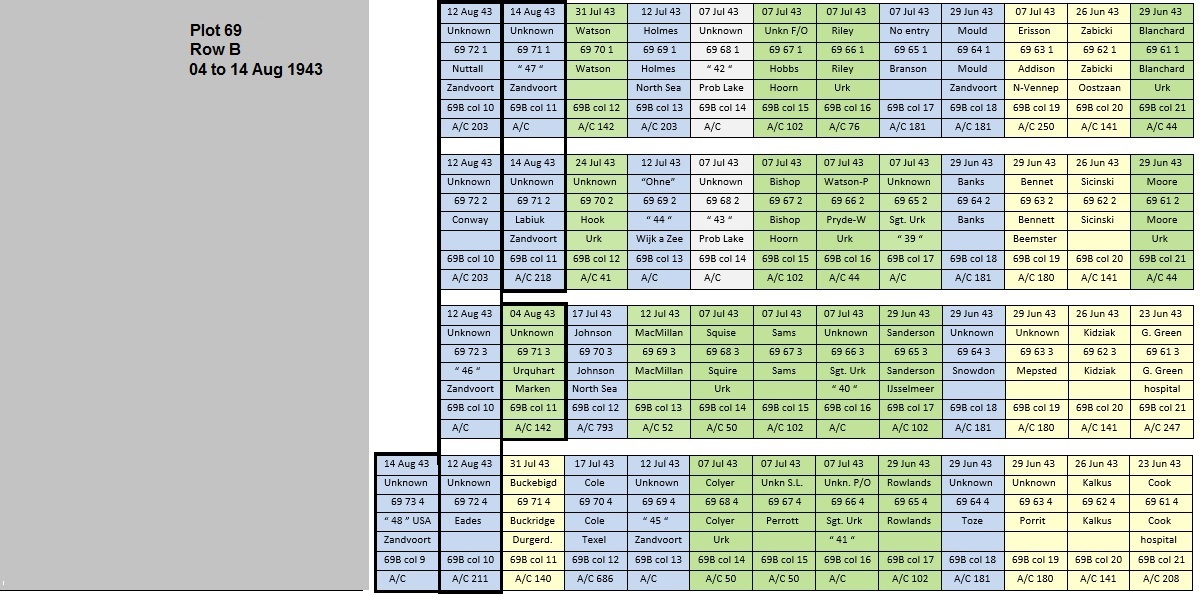 On this day, three unknown airmen were buried. They came from Zandvoort beach (Dutch North Sea coast). In the post war examination in 1946, they were a Canadian, an Australian and an American. The man from Canada was Sgt. George Labiuk (RCAF) of Stirling III, BF572, down west of The Hague in the North Sea in the 22/23 June 1943 Mühheim raid. The Australian (originally thought to be a Sgt.) was not identified (Unknown no. 47). With their coffins (71-2 and 71-1) grave 71 was full and was closed.