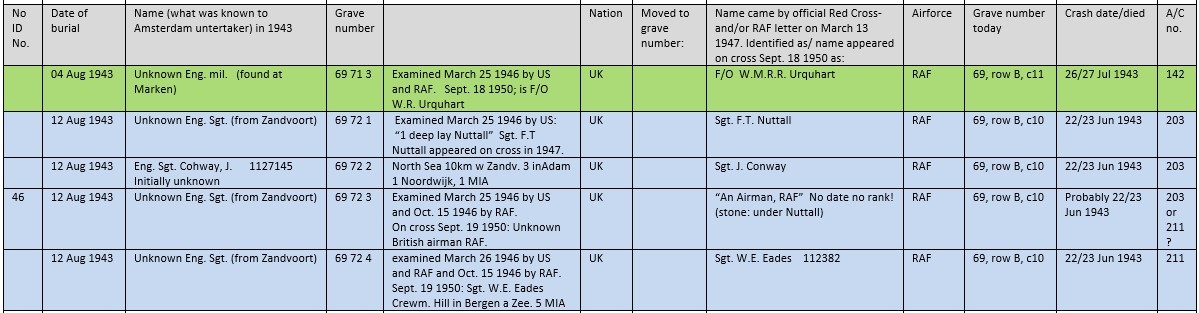 Mosquito VI, HJ786, 605 Sqn, pilot Flying Officer William M.R.R. Urquhart and his navigator Adam G. McArthur Watson. They had to make an intruder attack on Soesterberg airfield in the night of 26/27 July 1943. Damaged by Flak they came down in Lake IJsselmeer southeast of Marken Island (Kuil van Marken). Watson was buried early on July 31 in coffin 70-1. Pilot Urquhart washed ashore later at Marken Island. He remained unidentified and was buried as Unknown Eng. Mil. in coffin 71-3 on August 4. In 1946 his remains were examined and in September 1950 all was cleared and his name added on the cross.