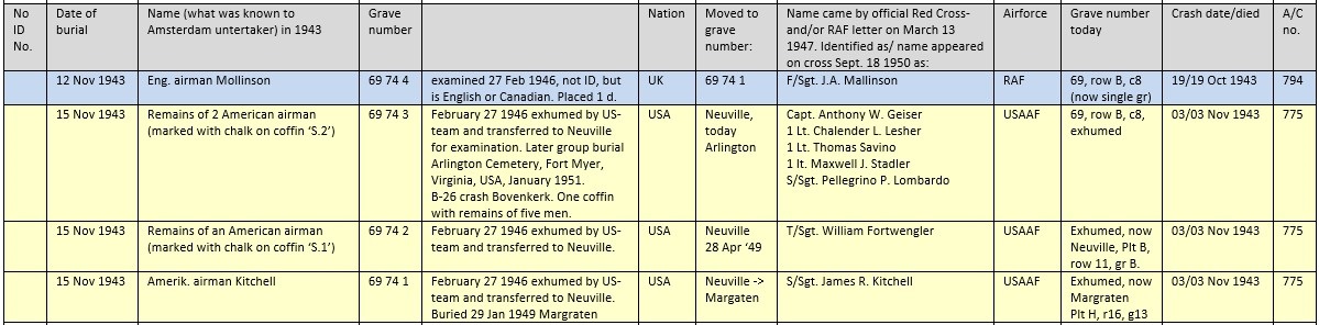Then on the 15th of November everybody knew they had an American crew to bury, because the Americans had made a daring daylight attack on Schiphol airfield 3rd of November 1943. These men were not buried as 'English mil.' but as 'American airman'. Aircraft shot down was B-26 Marauder 41-34963 "Bugs Bunny" of the 323BG, crew Captain Anthony Geiser (down at Amstelveen-Bovenkerk). The remains of two airmen (two men according to the burial card) were put in coffin no. 74-3 (above Mallinson). Above that was coffin 74-2 with remains later identified (in Neuville) as T/Sgt. William Fortwengler. The grave was closed with upper coffin 74-1, S/Sgt. James R. Kitchell, the only one recovered with name after the severe crash and subsequent fire on the ground. Exhumed March 4, 1946 and because he was identified by name, he was interred in US Cemetery "Netherlands" in Margraten. The others were transferred to the American ID-center in Neuville-en-Condroz (Belgium). Since then RAF F/Sgt. Mallinson rests alone in grave 74 (just as F/O Mackenzie in grave 73).