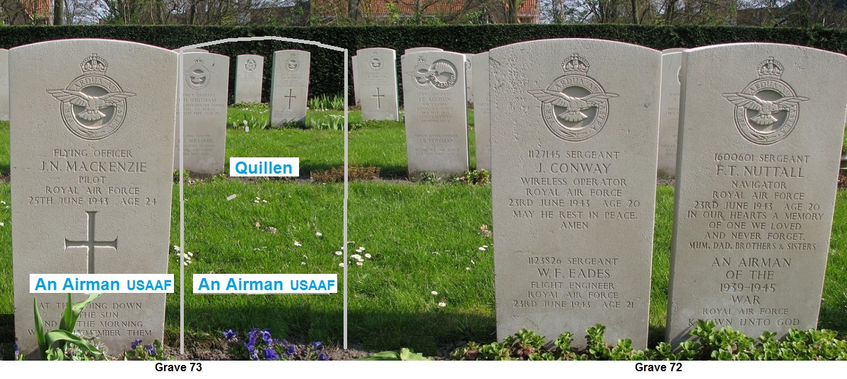 On the 4th of March 1946, the American airmen (Lt. Quillen and the two unknown) above and below F/O Mackenzie were exhumed by an American Quartermaster Grave Registration Company. Their grave markers were removed. Since then English RAF Flying Officer James N. Mackenzie is the only casualty in grave 73.