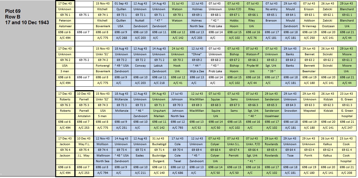 July 1943 until December, 47 airmen were buried centre of row B. Twelve deep graves were used, in each grave four coffins stacked. The RAF attacked the German war industry in the Ruhr Vally almost every night. The casualties buried most washed ashore at Urk (Lake IJsselmeer/Old Zuyder Sea) or the Amsterdam North Sea beach at Zandvoort. All crew of bombers, shot down by German Flak or nightfighters on route to or from the targets in the Ruhr Vally. Gradually the American airforce became active in the Dutch area. Among the 47 dead were 11 Americans, also bomber crews.