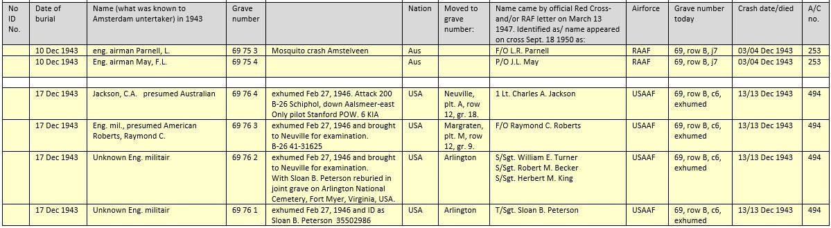 Mosquito DD739 (456 Sqn) supported a RAF attack on Leipzig, night 03/04 December 1943, crashed at Amstelveen. Australian crew Pilot Officer John L. May and Flying Officer Leslie R. Parnell were buried here on 10 December in coffin 75-3 and 75-4 as "Eng. airman Parnell, L. and May, F.L.".