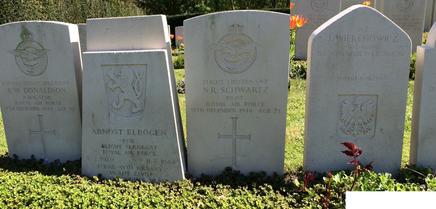 Grave 81 with the three Canadian Flying Officers Carson, Hill and Shannon, washed ashore Zandvoort beach mid July 1944. (Halifax LK879). Grave 82 with RAF Mosquito navigator Donaldson, Spitfire pilot Arnost Elbogen (Czech headstone), Mosquito pilot Schwartz and Polish Spitfire pilot Jan Wierchowicz. Grave 83 with Dutch soldier Cornelis Meur and three men of the crew Halifax NA347: Sgt. Gillon, Hogg and F/O Lytle. The individual graves 84, 85 and 86 with NA347 crew pilot F/O John W. Scott, Sgt. Stanley Thomas and F/O Arthur Farrow. After Farrow, the rest of Row A in 1945 remained empty. Until a few years later when Plot 72 was exhumed and the empty spaces in row A were used for reburial. Next to F/O Farrow rests now Sgt. Kenyon (June 1940), P/O Saunders (June 1940), Sgt. Swallow (June 1940) and Sgt. C.W. Thorley (June 1940). See their stories in the Amsterdam 1940 section.