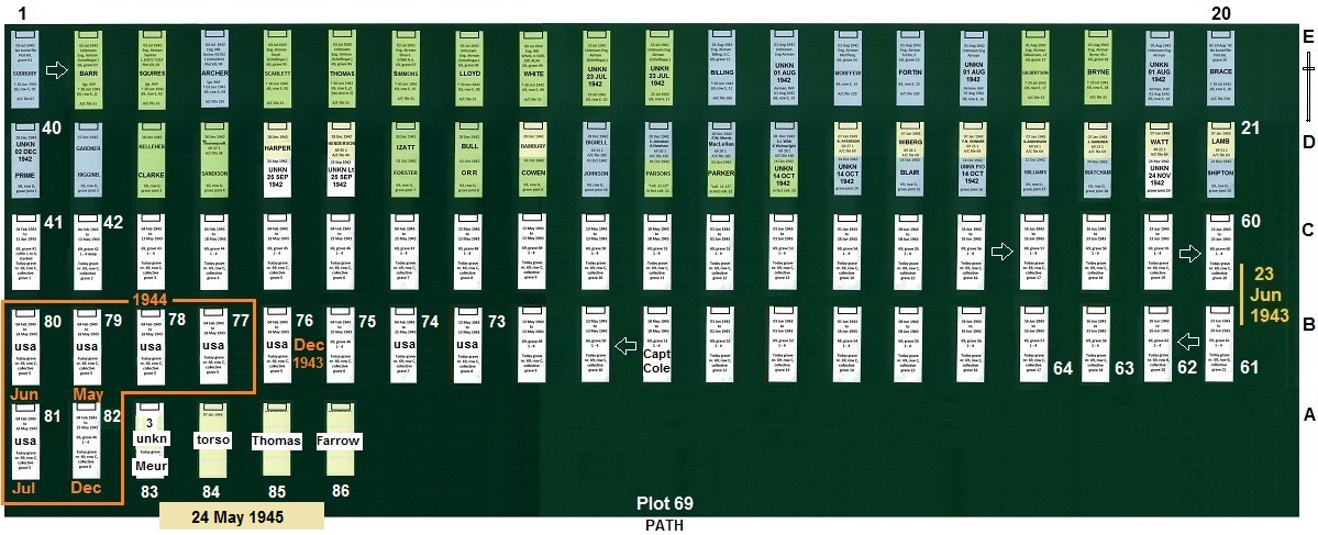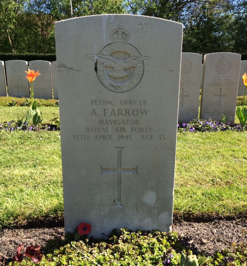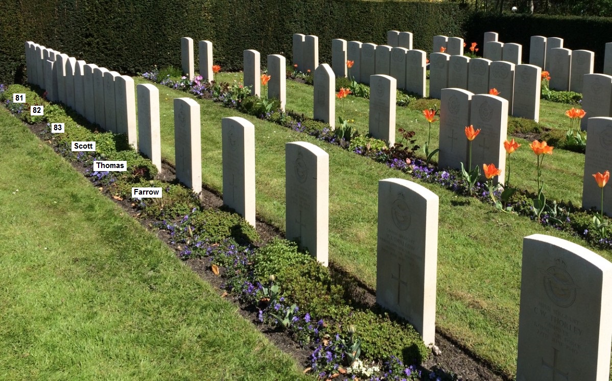 Grave 86. 24 May 1945. In coffin 86-4 was buried 'Eng. Officer Farrow'. Headstone today: navigator Flying Officer Arthur Farrow.