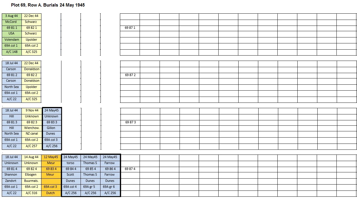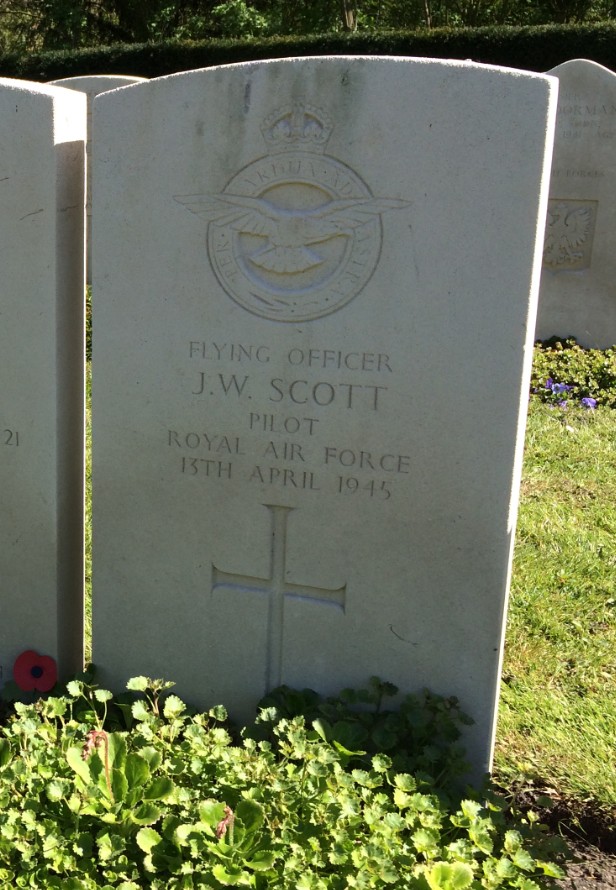Grave 84. 24 May 1945. In coffin 84-4 was the torso of an airman, without name. Headstone today: Flying Officer (pilot) John W. Scott.
