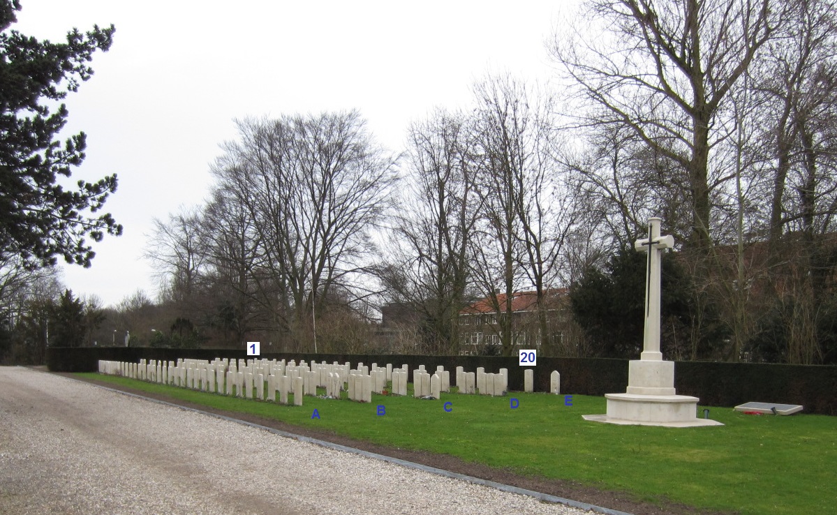 Above. War graves Plot 69. Dutch soldier Meur and crew of Halifax NA347 are buried on the far end of front Row A, where the headstones are close together.