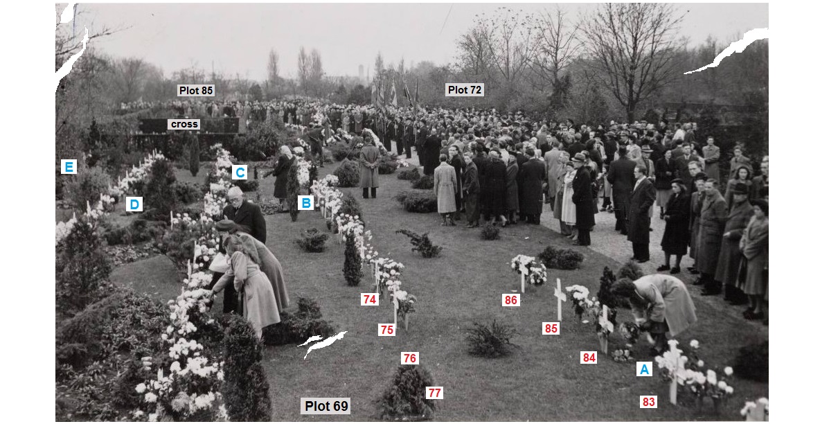 Grave 83 has an extra large name plate in front, because the names of four persons are on it: Private Meur, Sgt. Gillon, Sgt. Hogg and F/O Lytle. The American graves 76, 77 (78 and 79 not visible) on this end of Row B are empty (exhumed). Row A was not used after grave 86 of F/O Farrow. Later on Row A most of the graves of Plot 72 (1940 - Sept. 1941) would be replaced here. The Cross of Sacrifice is not there yet. On this position are civilian graves that later would be exhumed, after which the cross was placed. The people are standing also in the curve around Plot 85. In the centre flowers are laid down, flags of the Allied nations are held in front.