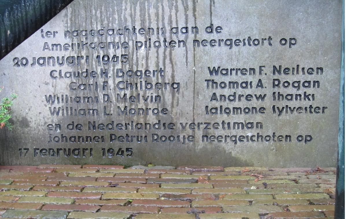 The people of Midwoud erected this monument for them. Text reads: "In commemoration of the American pilots crashed on 20 January 1945". Below: "and the Netherlands resistance man Johannes Petrus Roosje shot on 17 February 1945". The propeller is original and several items of the B-17 are kept in this village.
