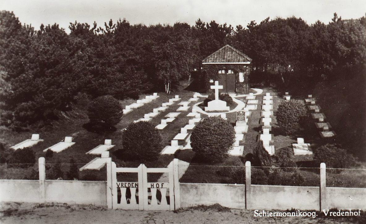 On 9 July 1906 an unknown British fisherman washed ashore, he was 65 years old. He was buried on a dune, one boot on his feet. In 1917, the space around his grave became the cemetery and his grave got grave number 1. In the first World War the cemetery grow with 12 graves, all washed ashore navy sailors: 11 German and one unknown British. Postcard below shows the situation in 1922, one of the first photographs of this cemetery. The perimeter is fenced off with chicken wire. White stone cross in the back reads 'Oorlog 1914-1918'. Cemetery gate is a steel rod fence with name 'Vredehof'. Tool shed/morgue behind the cross is not build yet. 'Vredehof' (Yard of Peace) is a Dutch translation of the German word 'Friedhof'.