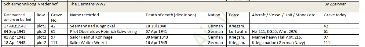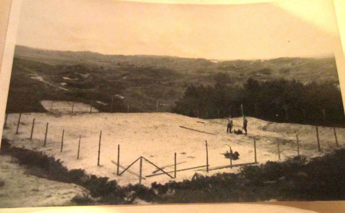 The above photo shows the still fresh graves of the three RAF airmen; crosses with heaps of sand in front, this in contrast of the 1914-1918 graves. The photo shows details mentioned earlier in this article: left the in 1930 added 5 July 1917 German sailor, German Sailor (minesweeper incident) Otto Kranich from Oelze, Karel Lohry, Gerhard Spiessen's grave drum, civilian sailor "L.F" in the right upper corner, the only British WW1 casualty "English 14 September 1918" (right side) and the unknown German sailor 'Linke' washed ashore 30 May 1917.