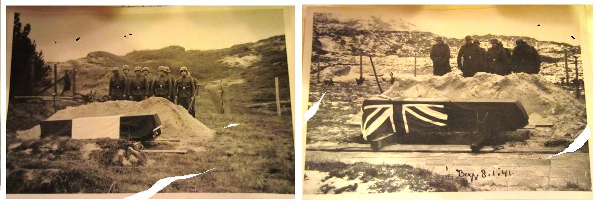 Photo below: on 4 September 1941 there was a funeral for washed ashore German pilot Oberfeldwebel Heinrich Schwiering (grave 61). At this funeral also a group of German navy sailors attended. A week later on 11 Sept, the cemetery and grave were inspected by this German naval officer. His rank is vice admiral. We believe he is Vizeadmiral Johannes Bachmann. He was Küstenbefehlshaber Deutsche Bucht, naval commander of this area from Feb. 1941 until June 1942. He was killed in April 1945 in a contact with American forces. On the right the grave monument and grave drum of Gerhard Spiessen are well visible.