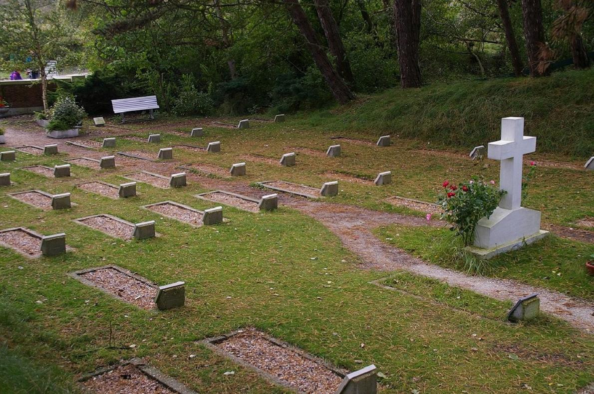 Grave 49. Unknown "dressed in black coat, blue trousers and rubber boots, buried 14 Oct. 1940". Today on headstone 'Unknown French, 14.10.1940, mort pour La France'. No doubt a French sailor, Dunkirk victim.