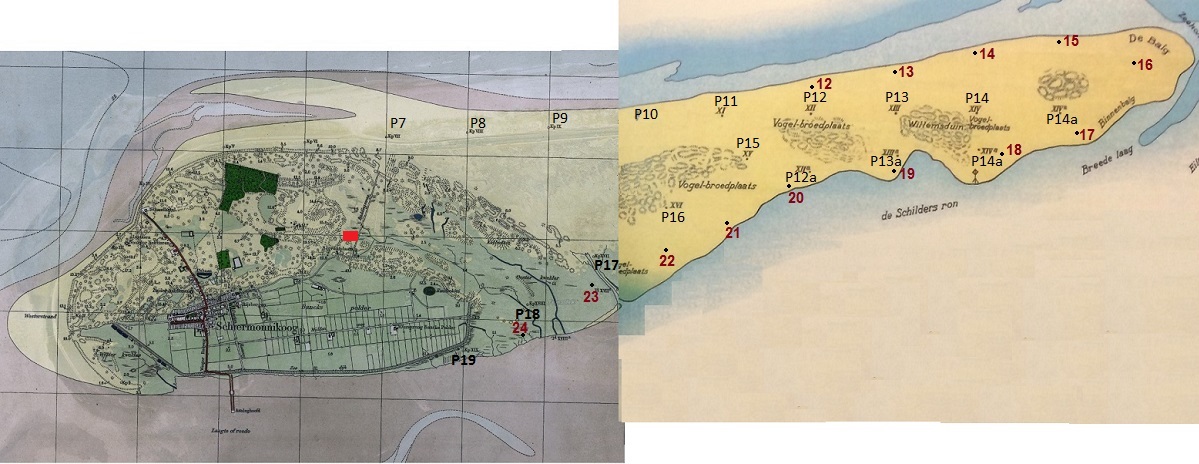 Newspapers in 1949 said that finding position of the 1949-body was only 200 meters from the 1943 crash site or pole 15. However, 200 meters is a considerable distance on a beach and area were so many airmen washed ashore in WW2. A link between Halifax BB252 cannot automatically be made, even if a crew member had been missing. The position of pole 15 has changed over the years. The old Dutch WW2 position of pole 15 was in the center of the Island. See map below, not at todays pole 15 position at 'De Balg'. Most probable is that the 1949-airman is a washed ashore airman period 1938-1947. The headstone inscriptures also point into this direction. In March 1974, again after severe storms, the Dutch Airforce Recovery Unit (Mr. Gerrit Zwanenburg) was called in to take a look at a Rolls-Royce Merlin XX (20) and a Halifax-wing that were uncovered by the storm at position pole 15,6 (position of pole 15-16 in 1974). The engine and the wing belonged to Halifax BB252.