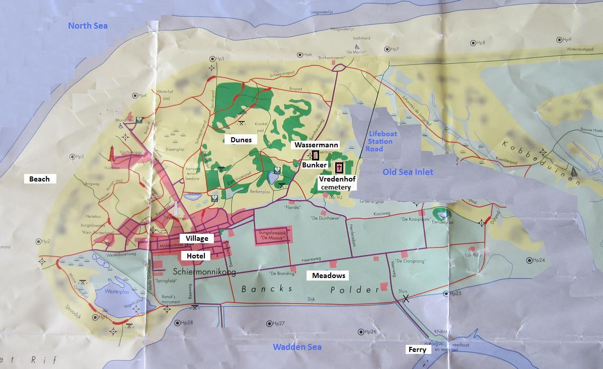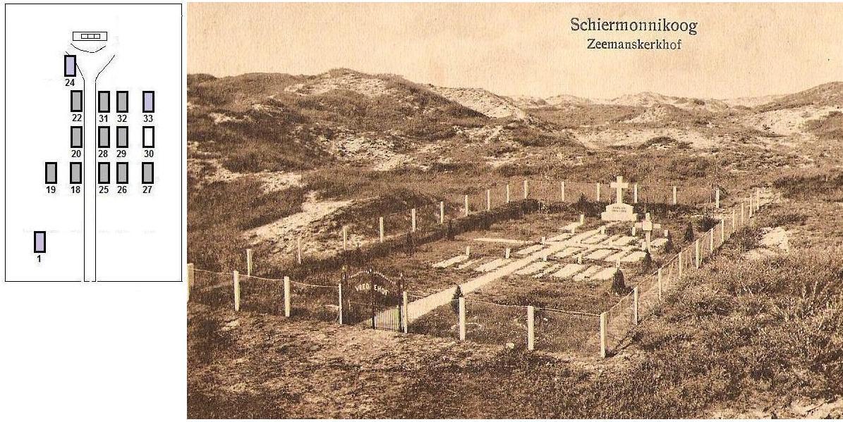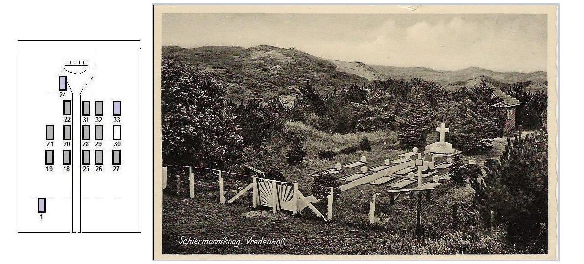 First grave dates year 1906, last 1968. Hundreds of sailors washed ashore on this island since medieval times. Originally they were buried without much formality at the foot of the dunes, often too close to the sea, which exposed the bodies again after a storm. From 1863 onwards, burials were made higher up the dunes along the road to the lifeboat station. In 1917, under pressure of a growing number of washed ashore WWI sailors, local townsmen among them hotel keeper Mr. Sake van der Werff took initiative to give the burial location a more permanent and dignified status. With help of the owner of the island at that time, German count Ernst August von Bernstorff (all his islanders were and are Dutch) a small cemetery was set up, Vredehof. It grew considerably in size during WW2. In this article the build-up of the cemetery is explained.