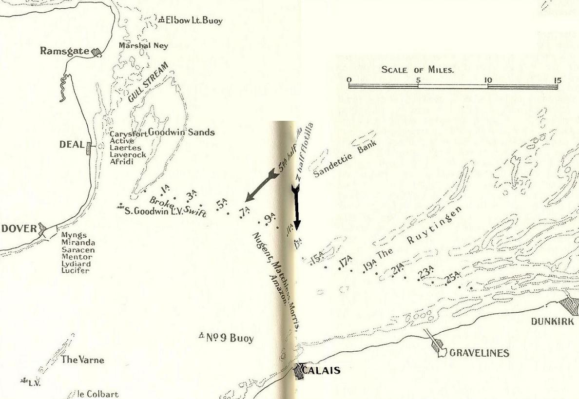 German ships in two 'half-flotilla' broke through the British blockade at 7a and 13a and turned to Dover. British destroyers HMS Broke and Swift at 3a stopped them.