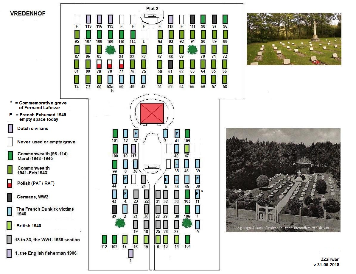 Vredenhof was and is a private cemetery for washed ashore victims of the sea. Because of WW1 and WW2 it became mostly a war cemetery. Organizations from different countries tried to take over control, but Mr. Sake van der Werff kept it independent. After his death in 1955, the management could not resist an offer by the CWGC for a new entrance. On Plot 2 the Cross of Sacrifice was placed for the cost of a grave position on each side of the cross.