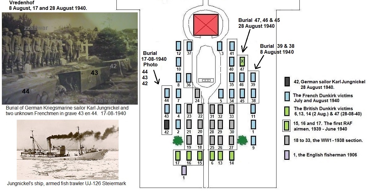 It tooks us some time to trace the history of Karl Jungnickel. He was aboard German anti-submarine ship UJ-126 that was torpedoed by Royal Navy submarine HMS H31 (Lt. Wanklyn) on 18 July 1940. This was 16km northwest of Terschelling Island, about 75km west of this cemetery. The UJ-126 of the 12th Unterseeboots-Jagd Flotille was the former German civilian fishing trawler 'Steiermark' and was coverted to submarine hunter. Karl Jungnickel was buried on 17 August, his body was on sea for a month and the sea added his body to the group of French Dunkirk casualties of the Emile Duchamp that died off Ramsgate and entered the sea on June 4, 1940. The wreck of the UJ-126 was discovered in 1985 and her cannon ended-up in a museum on Terschelling Island.